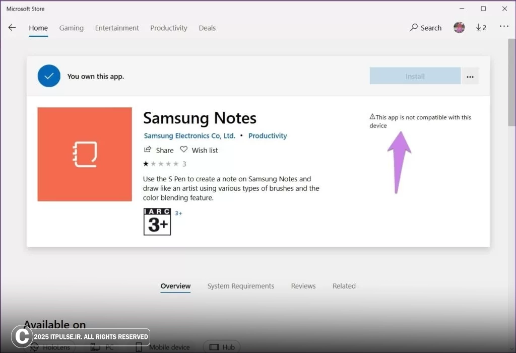 این اپلیکیشن از طریق Microsoft Store قابل دریافت است، اما برای اجرای آن نیاز به نصب اپ Samsung Account نیز دارید. هنگام استفاده از Notes روی دستگاههای غیر گلکسی، هشدارهایی مبنی بر بهینهنبودن تجربه کاربری برای این دستگاهها نمایش داده میشود، اما اپلیکیشن همچنان کار میکند.
