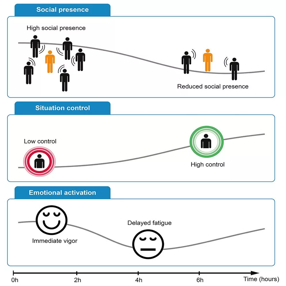 ۳ تا ۴ ساعت پس از پایان تعامل اجتماعی، اکثر افراد دچار افت انرژی و خستگی عاطفی شدند. این خستگی در افرادی که در محیطهای شلوغتری حضور داشتند، سریعتر و شدیدتر نمود پیدا کرد.