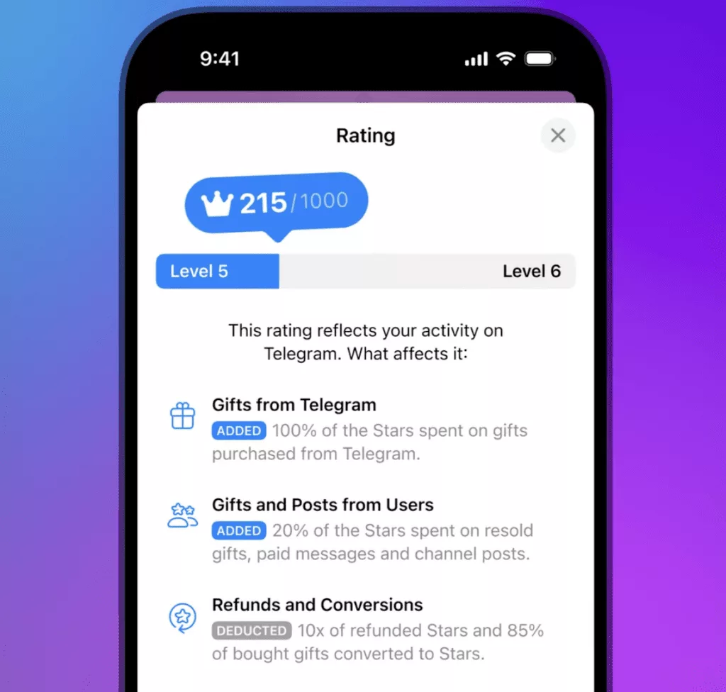 تلگرام در تلاش است تا اکوسیستم اقتصادی مبتنی بر Telegram Stars را گسترش دهد. از این پس، کاربران در پروفایل خود یک عدد بهعنوان رتبه خواهند داشت که براساس میزان تراکنشهای موفق آنها با ستارههای تلگرام محاسبه میشود. این رتبه میتواند میزان اعتبار و اعتماد به یک کاربر را در تعاملات اجتماعی مشخص کند.